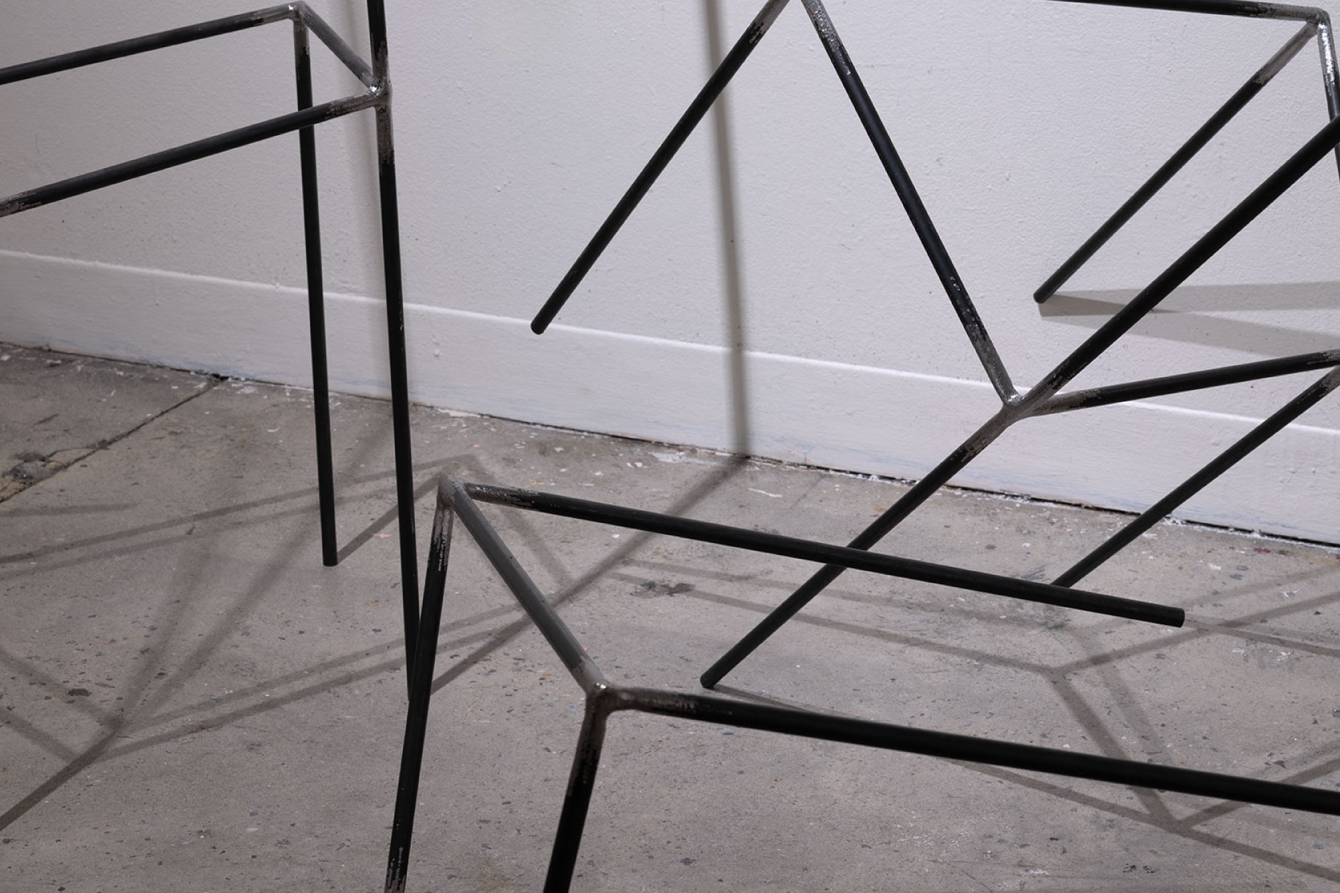 Moving on to sculpture, expectation is thwarted again. Steel chairs have lost their function bouncing off the wall while piercing it. Their empty seats, without any cushioning, embrace loss. A metal sculpture of a chandelier— also nonfunctional—dangles from the ceiling. Its weight and position make the visitor pause as it reaches out to the sublime by embracing both terror and beauty.